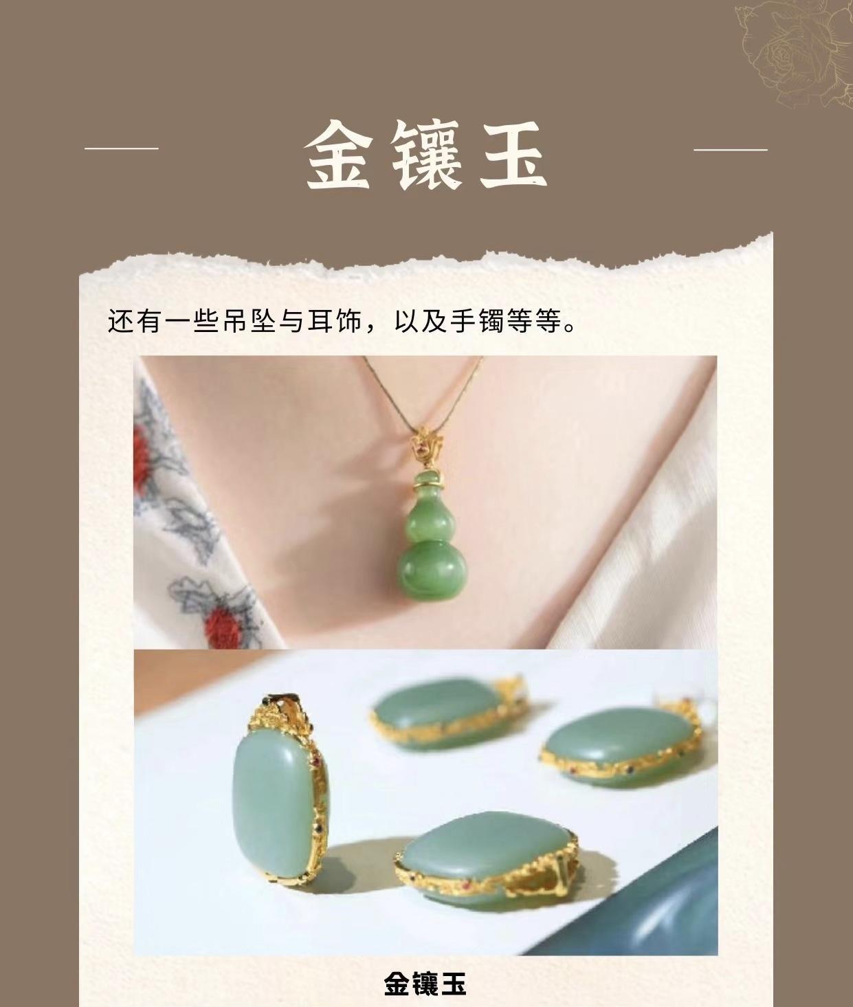 因爲金鑲玉的玉石選擇的邊角料,所以也決定了玉石不是很大,一般可以用作小吊墜、或者小耳環、戒指等配飾。