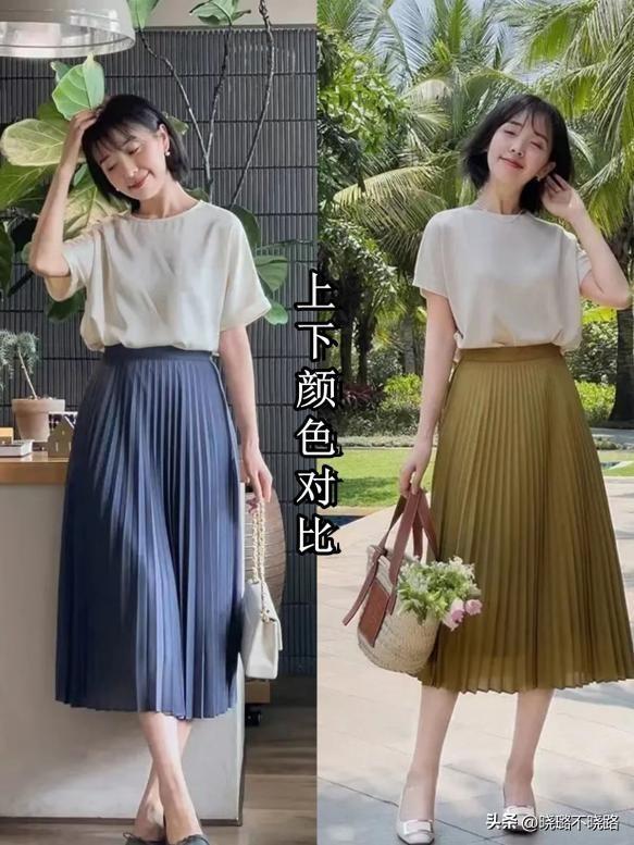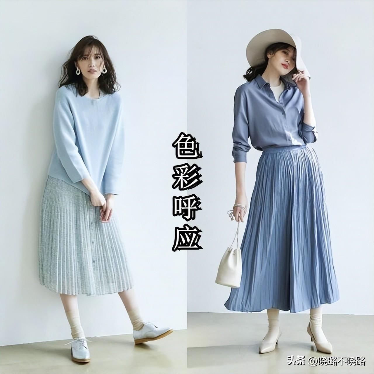 裙子的顏色也可以讓我們展現出不同的風格和魅力,尤其是自上而下的單品進行組合搭配的時候。選擇不同深淺的色系或者是異色調的顏色進行對比,可以明顯的分割出上下比例。這樣即使不進行身形線條的勾勒,也能巧妙地讓自己穿出大長腿的既視感哦~