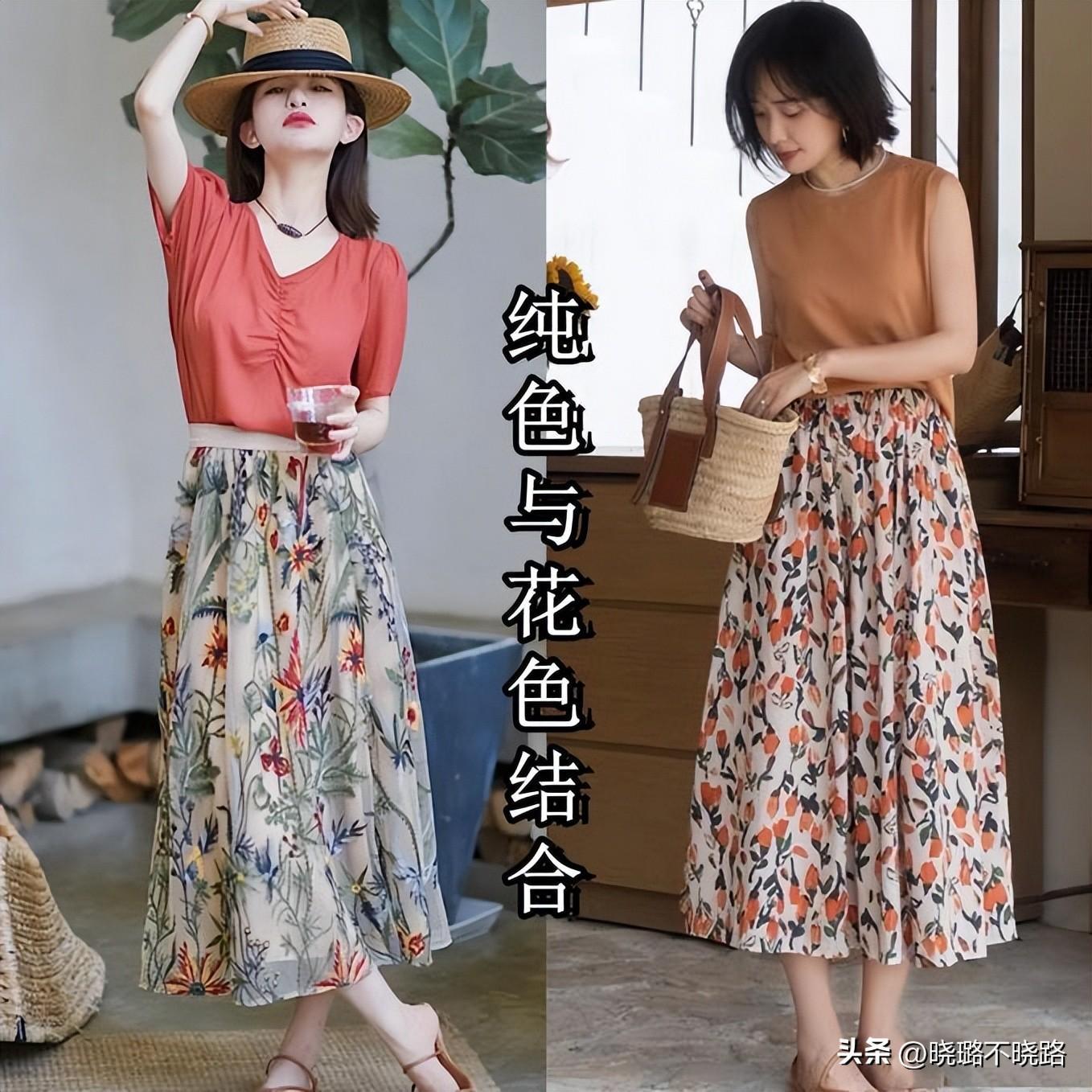 如果是上下系列的單品,那麼在顏色的搭配過程中,可以選擇純色上衣與花裙互相結合。這樣一方面可以選對高腰的位置進行勾勒和強調,增加造型的延伸效果。另外,也可以讓視覺狀態變得更加簡約一些。繁簡結合的搭配技巧,真的推薦大家借鑑起來喲。