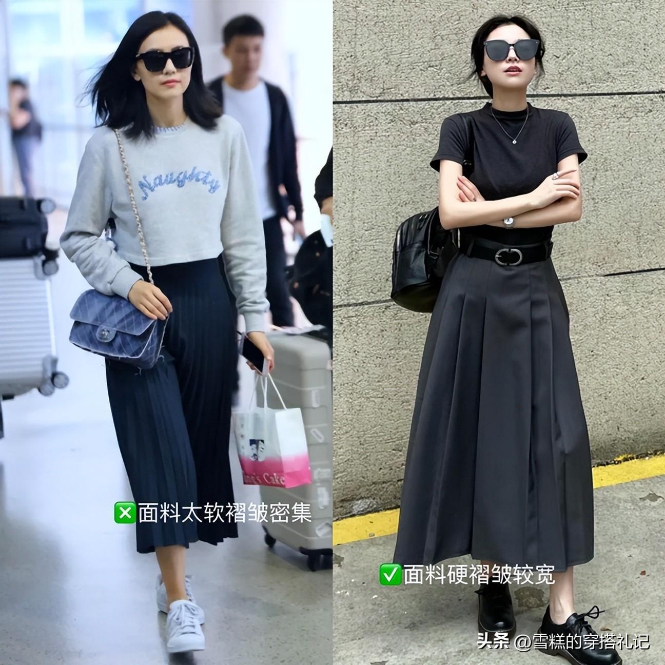 裙子的款式那麼多,選今年流行百搭的款式能給自己加分不少。選一款減齡有氣質的裙子,非百褶裙莫屬,裙子長度根據自己的搭配挑選,可以是及踝也可以在膝蓋以上的位置。總之百褶裙穿起來不想踩雷,就不要選材質太軟褶皺太緊簇的設計,顯得人老氣,選材質偏硬且褶褶皺寬的款式,線條流暢,穿搭有檔次。