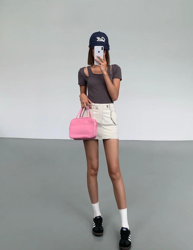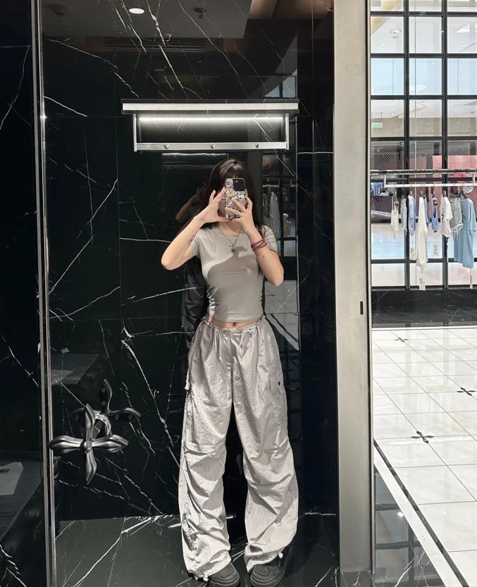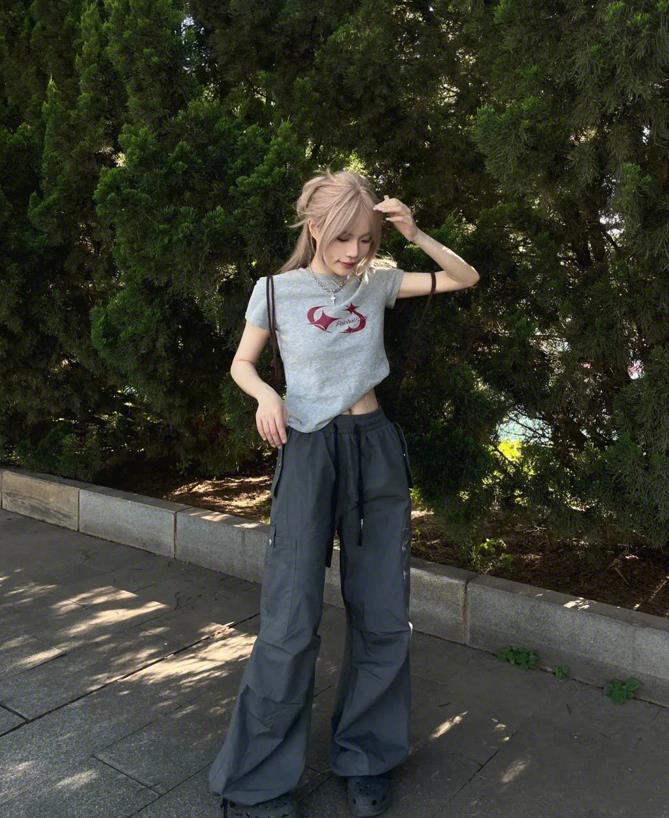 這套簡直太好看了,淺灰色短袖上衣,修身的版型,能將上身完美的身段勾勒出來,搭配一條同色的工裝褲,上緊下松的組合,對身材有着極佳的優化,腿粗、腿型不好看的姐妹,一定要試試這樣的褲子,誰穿誰好看。
