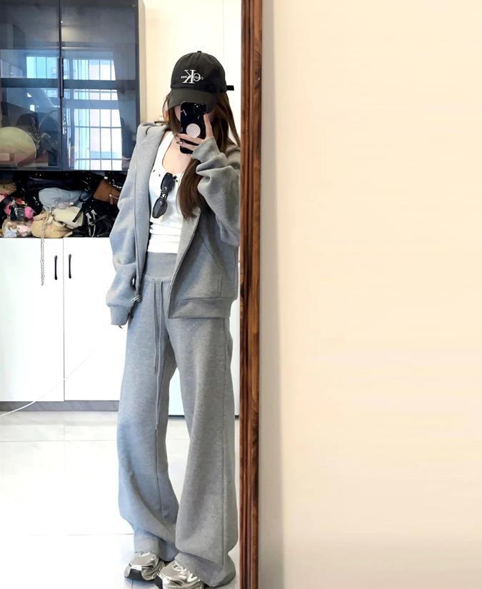 灰色系的衛衣套裝,自帶慵懶範的,整體看起來好韓好舒服啊,衛衣外套裏面可以搭配一件白色的短袖,或者是背心都是可以的,鞋子選一雙運動鞋來配吧,休閒舒適又自在。