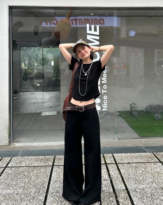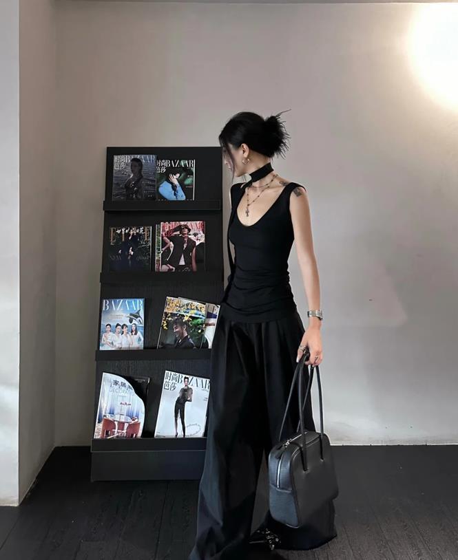黃黑皮能穿黑色嗎?答案自然是可以的,黑色背心,適當露出一些肌膚來,不僅顯得很清爽,還能讓你的膚色看起來沒有那麼沉悶。搭配一條黑色闊腿長褲,一緊一鬆的組合,輕鬆優化了整個身材。