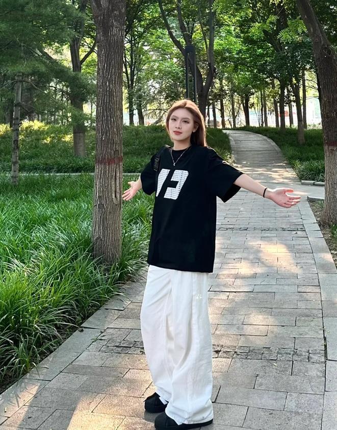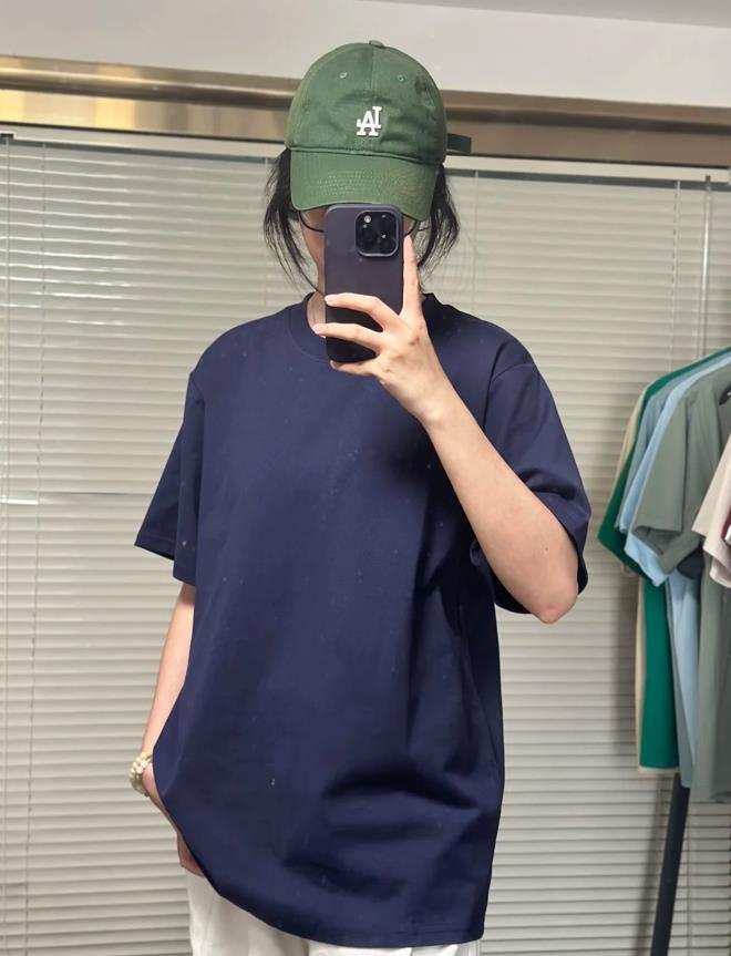 藏青色也是很適合黃黑皮女生的,這個顏色太好看了,不得不說這個色調還真的很襯膚色啊,寬鬆版型的t恤,最喜歡這種穿起來自帶慵懶氣息,又很藏肉顯瘦的款式了,搭配起白色的褲子,或者是牛仔褲,就很日常休閒。