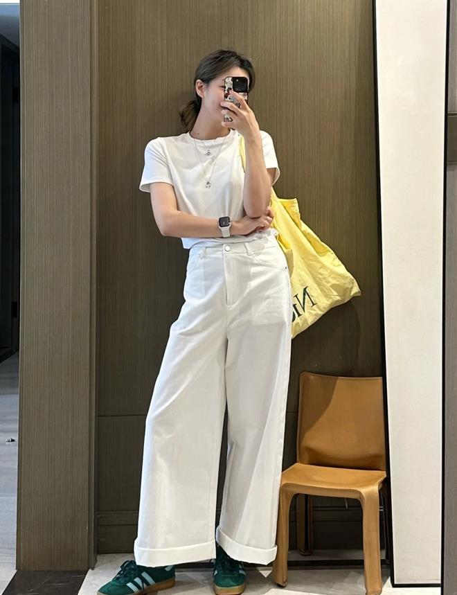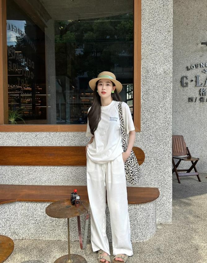 一身白色系的搭配,可太清爽乾淨了,基礎款的白色短袖t恤+白色休閒長褲,很喜歡這種鬆弛感的搭配,褲子的垂墜感很佳,上身後能把腿部線條給拉長,顯高挑又顯腿長。
