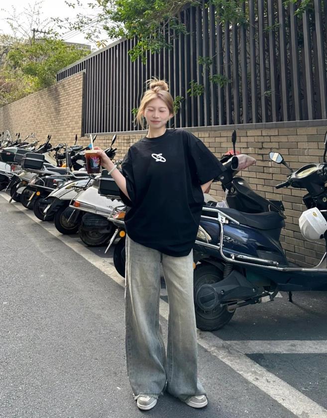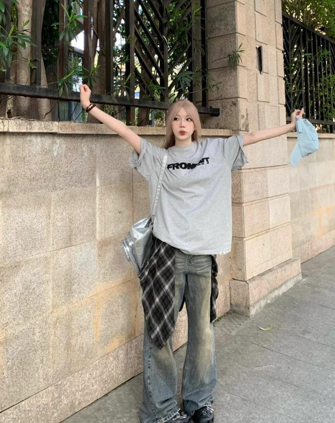 黃黑皮的女生,一定要試試灰色,這個色調就是很不挑人,寬鬆版型的灰色短袖t恤,自帶慵懶氣息,又很藏肉顯瘦,太適合懶人了,選擇一條牛仔拖地褲來配,感覺腿部線條瞬間就被拉長了。