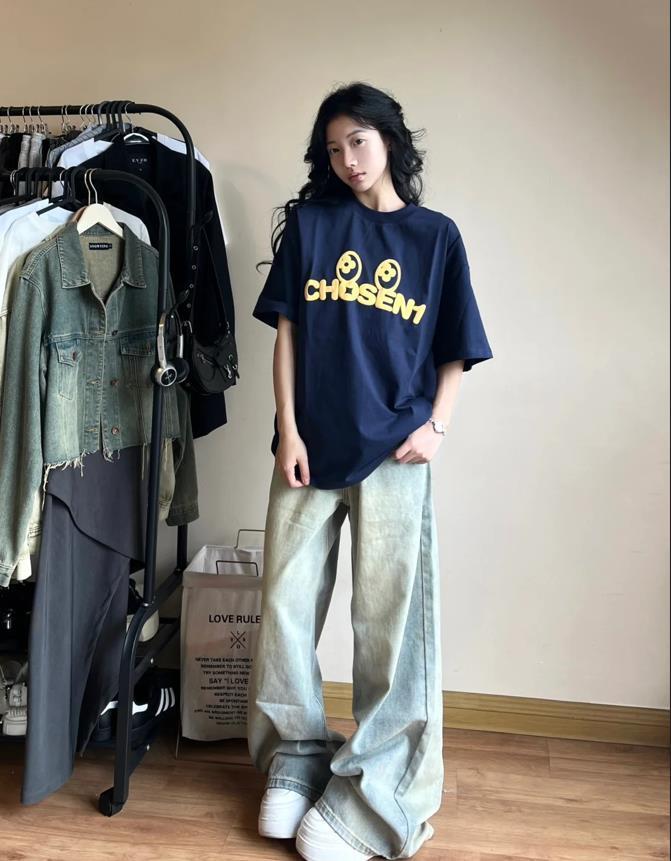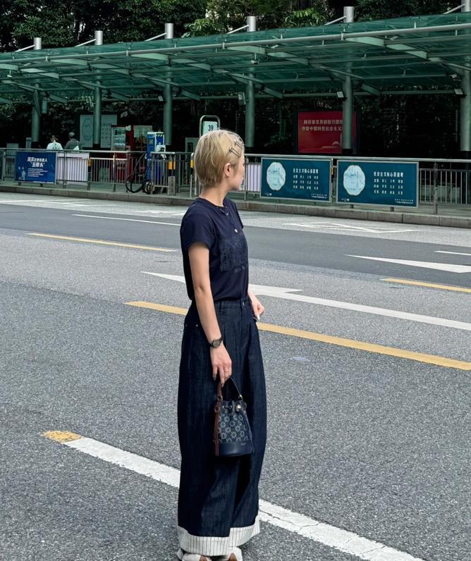 黃黑皮的女生們,一定要試試藏青色,因爲這個色調真的很襯膚色,藏青色的t恤,寬鬆的版型加持下,可顯瘦藏肉了,搭配垂墜感十足的牛仔闊腿褲,能舒服一整天呢,慵懶範十足。