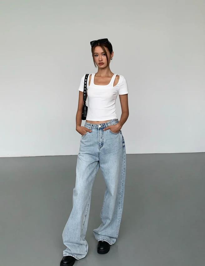 除了黑白灰自帶高級之外,藏青色也是很不錯的一個色調,它很時髦有質感,而且也巨顯白,藏青色短袖t恤+牛仔藍闊腿褲,寬鬆的版型,可太顯瘦了,記得要把t恤塞進褲子裏面,這樣才能更好提高身材比例。