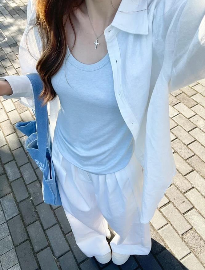 真的好喜歡這種清冷感,白色亞麻襯衫,內搭是一件奶藍色短袖,你有沒有覺得藍白配真的特別適合夏天呢?下身選擇一條白色闊腿褲,很顯鬆弛感的一套,不管是日常,還是上班通勤都可以。