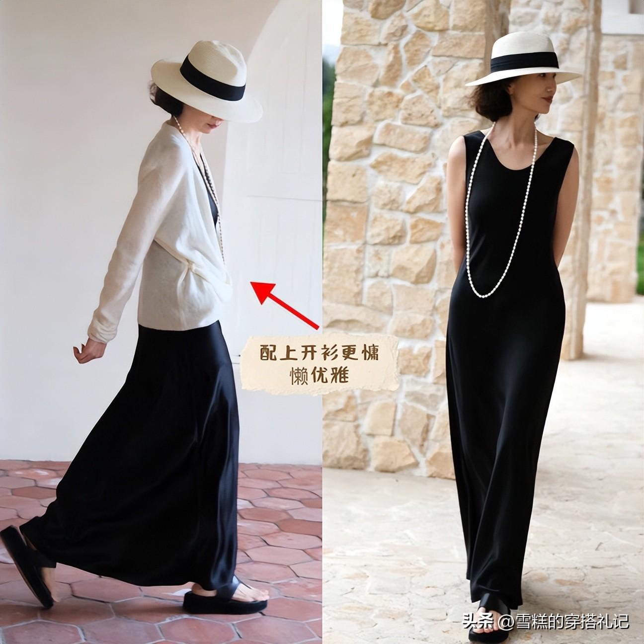 ❷極簡優雅風:開衫+吊帶連衣裙+禮帽