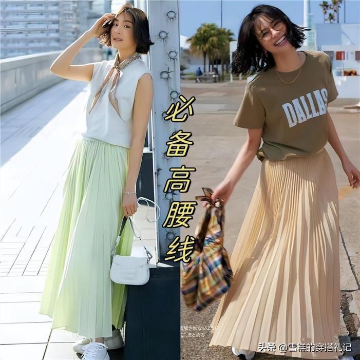 我們選擇百褶裙和T恤進行搭配的時候,爲了優化身材比例,其中最簡單的方法就是提高腰線的位置。這樣可以很明顯的拉長我們的腰線,輕鬆實現顯腿長的穿着效果。另外,也可以考慮到避免腰部堆積的問題,可以直接選擇短款的T恤進行搭配,這樣“上短下長”的視覺效果也會更加明顯。