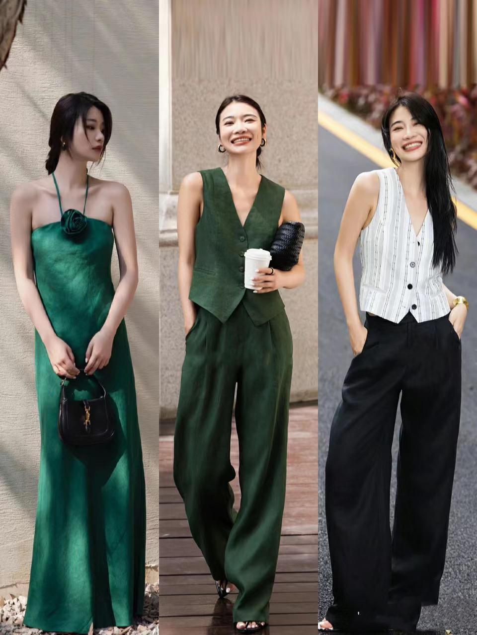 度假風穿搭,除了準備馬甲+闊腿褲的套裝,高級色的長裙、也必不可少。