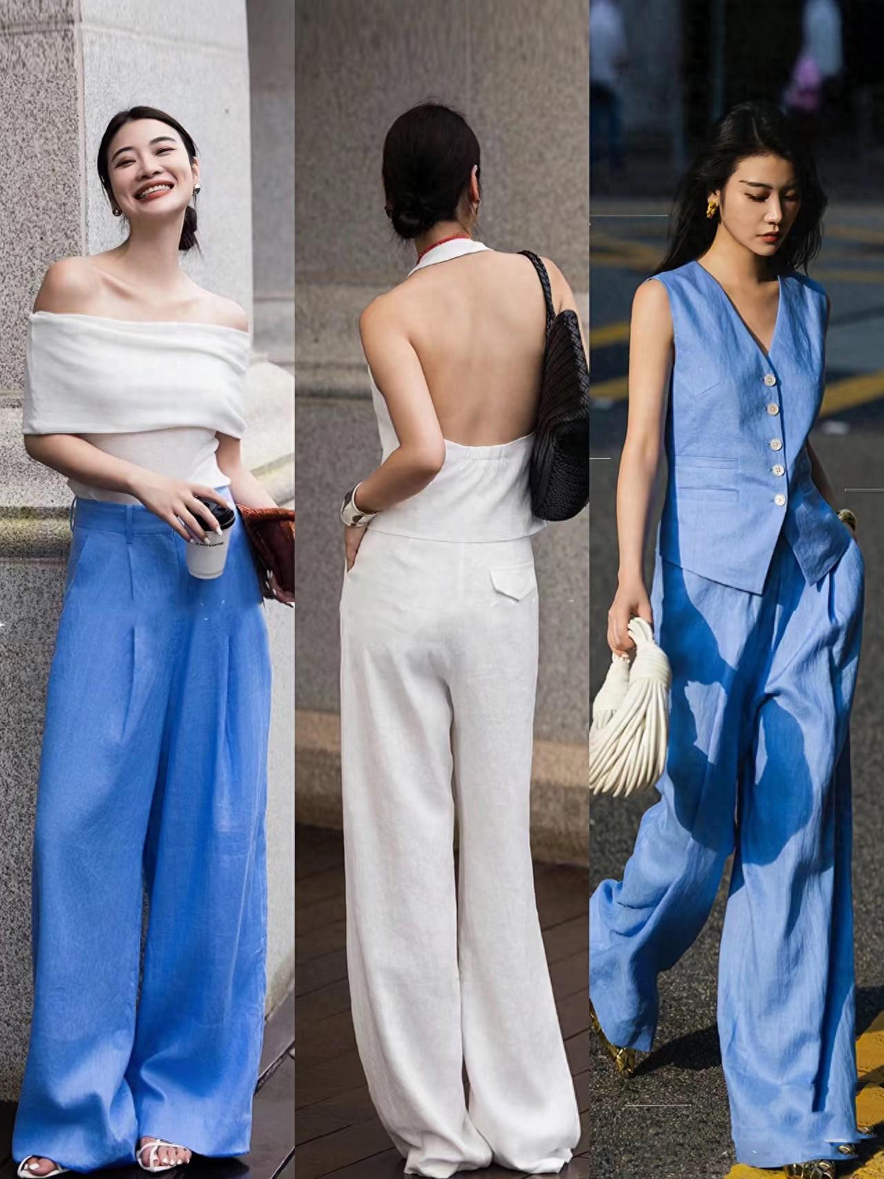 馬甲+闊腿褲的套裝,以上緊下寬的設計,營造出時尚氛圍。比如收腰馬甲+闊腿褲,選擇了乾淨清爽的藍色,鬆弛又自在。