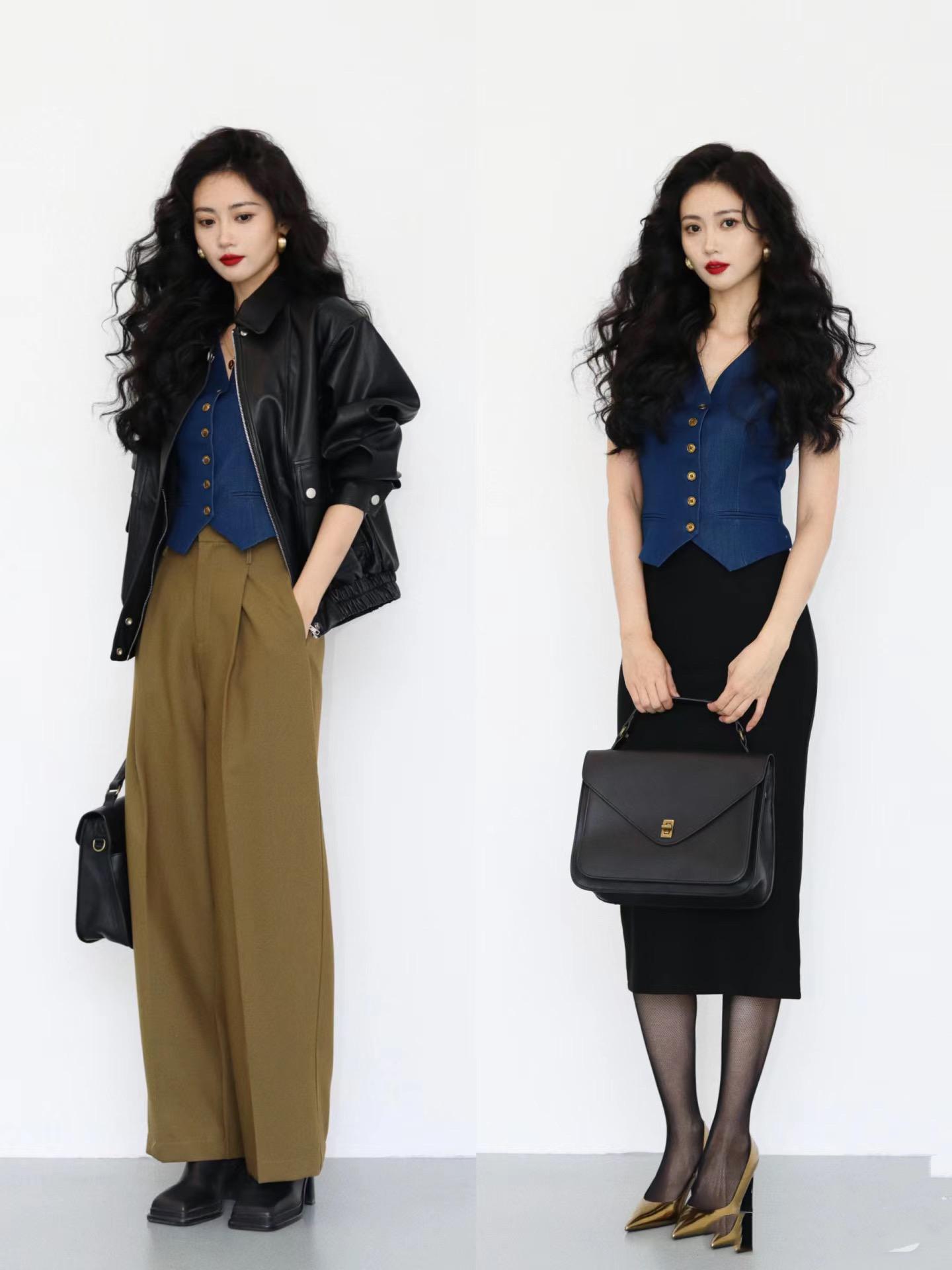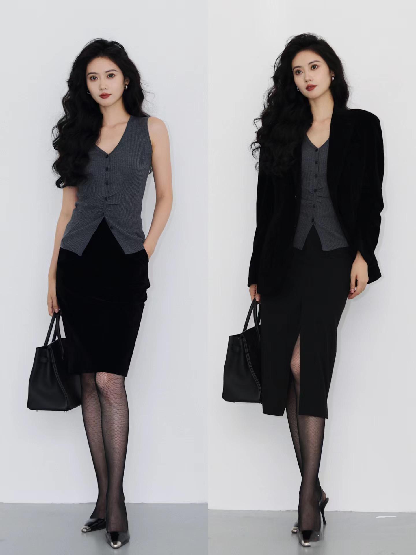 合身的內搭,以針織背心+包臀裙爲主,初秋時節的黑絲襪也更顯瘦。踩一雙高跟鞋,職場女性的幹練就有了,配寬鬆挺闊的西服外套很大方。