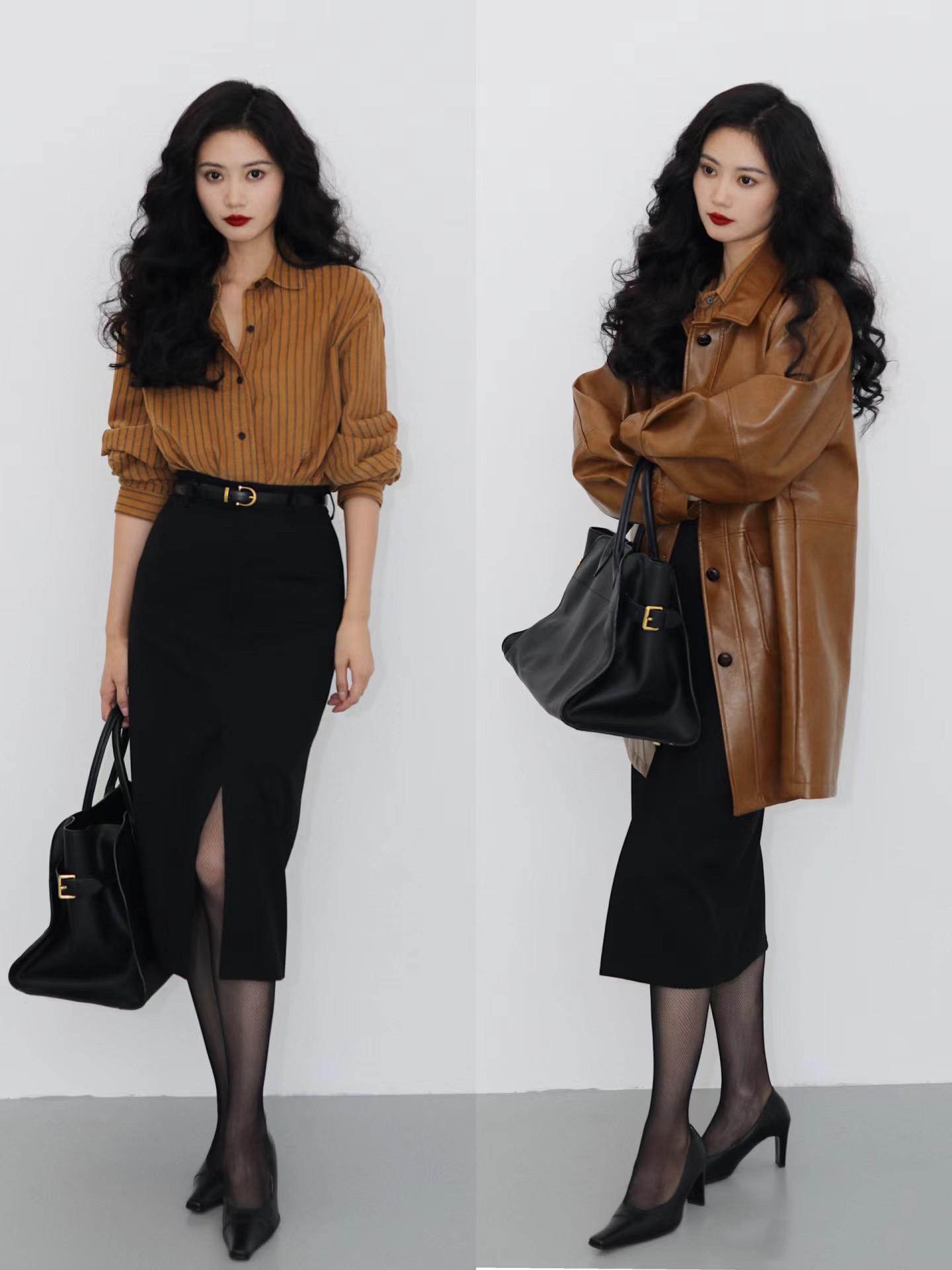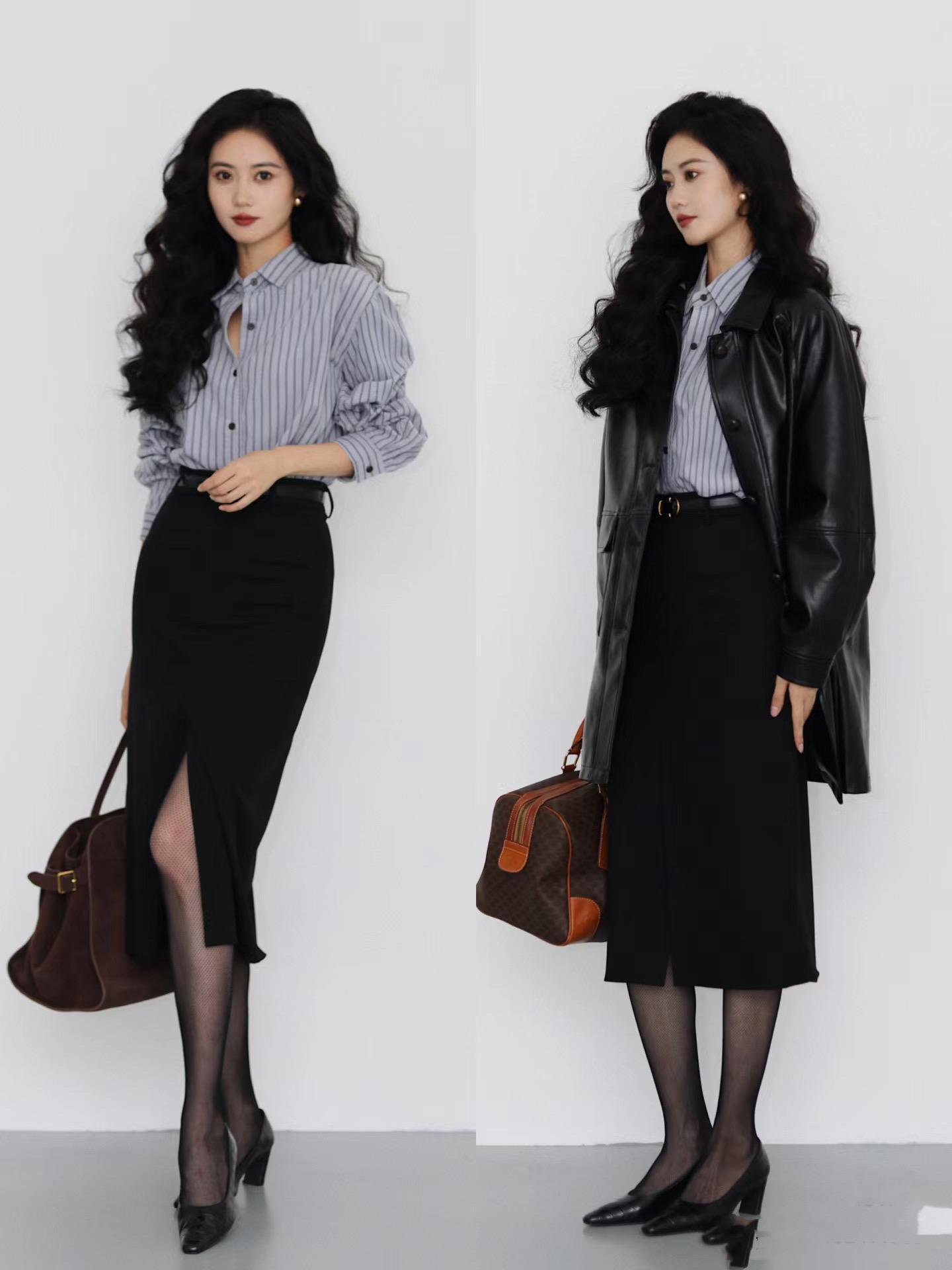 初秋時節,就穿條紋襯衫配開叉的黑色半身裙,一雙尖頭高跟鞋也很顯腿長。天氣轉涼,就搭一件棕色皮衣外套吧,酷颯又霸道。