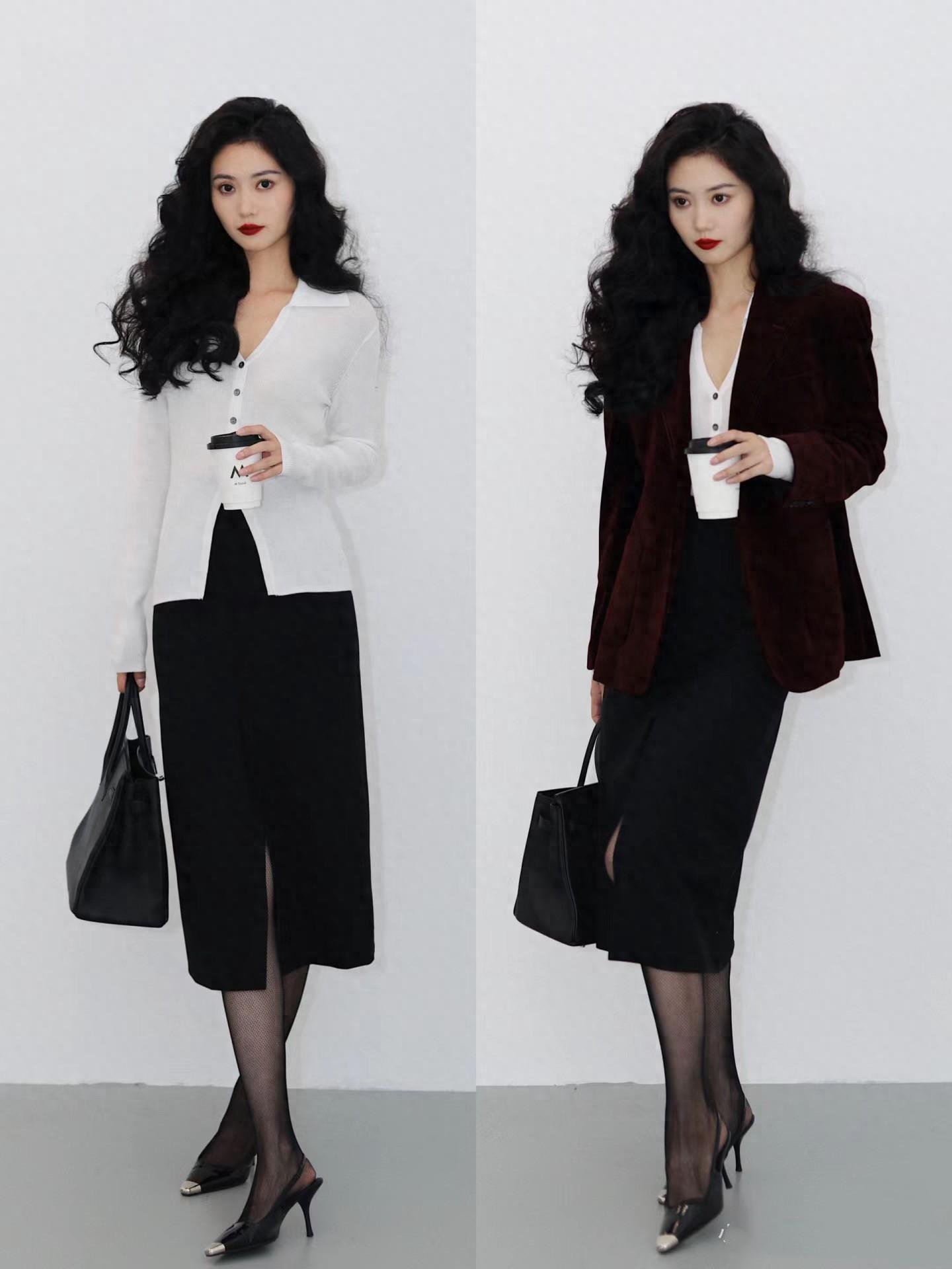 外鬆內緊,是一種常見的穿衣模式。融入到通勤風穿搭裏,會表現出高智感的美。比如修身針織衫+包臀裙,簡簡單單就很大氣。