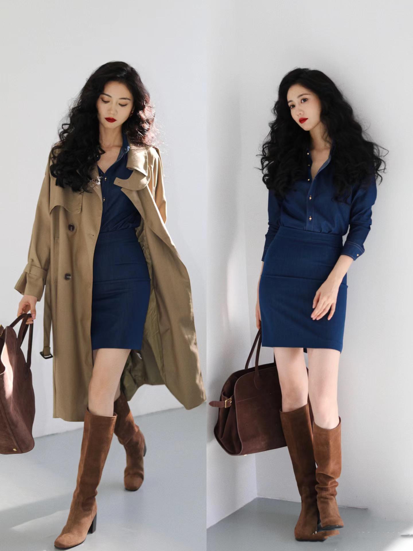 時髦且別緻的一組穿搭,真的太加分了。藏藍色牛仔套裙,穿在身上超級顯白。配棕色長靴,也是又酷又美。