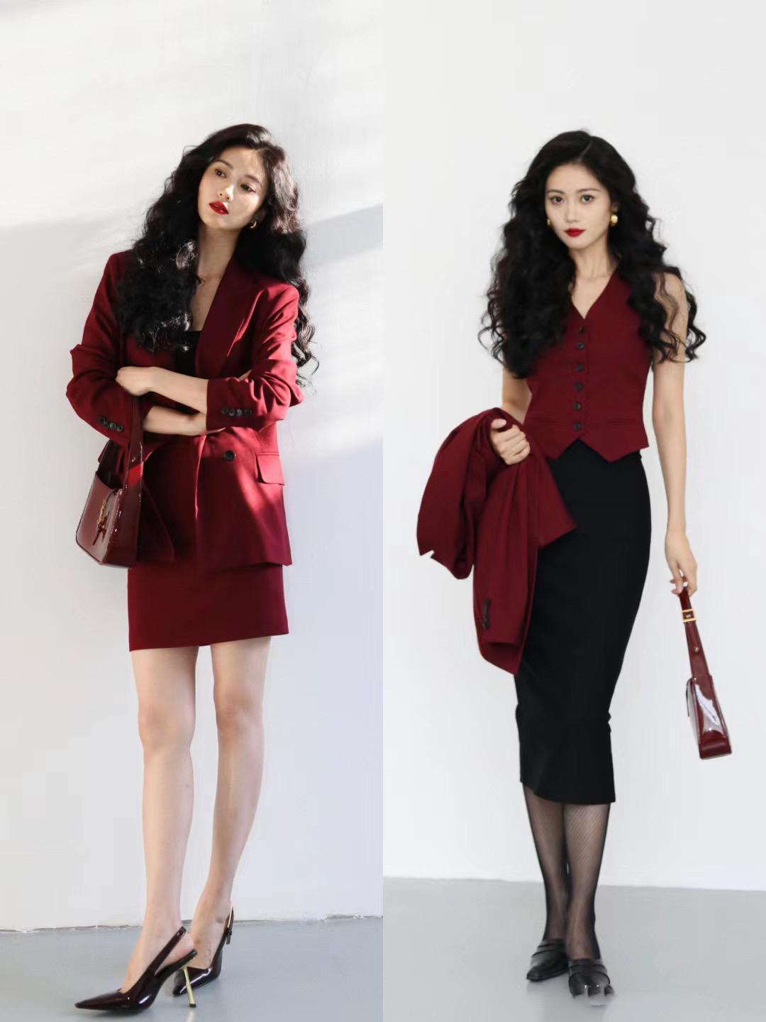 不同於常規的穿搭,高智感穿搭就是爲成熟女性量身定製的。像酒紅色的西服套裝、馬甲短裙,都體現高級品味。