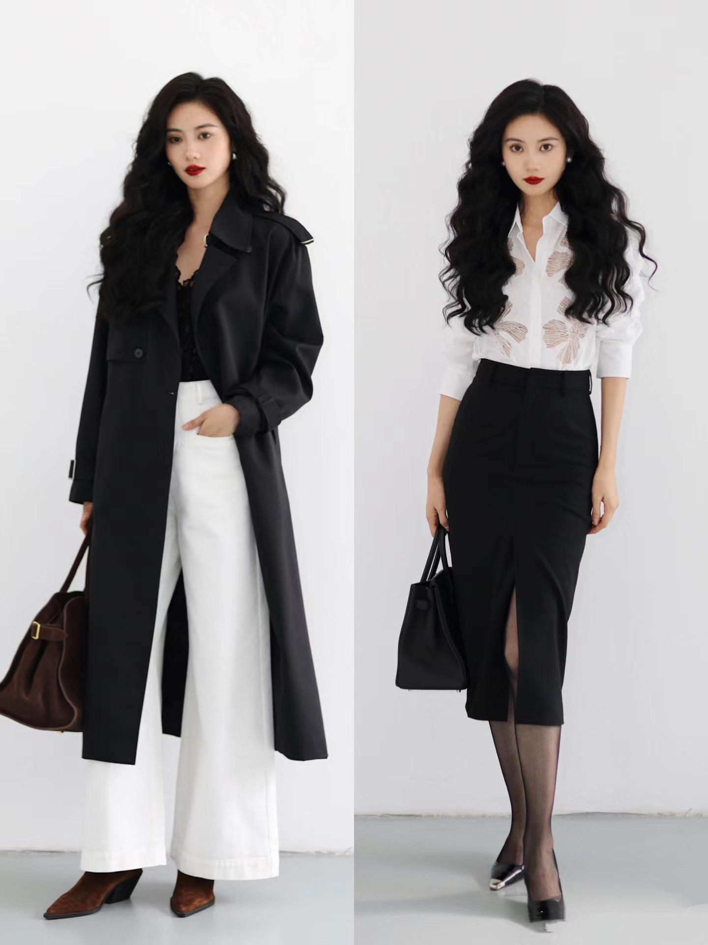 黑色風衣外套,流暢的H剪裁,搭配白色直筒闊腿褲,高腰款式超顯高。白色直筒闊腿褲不拖地的長度,太乾練時尚了。