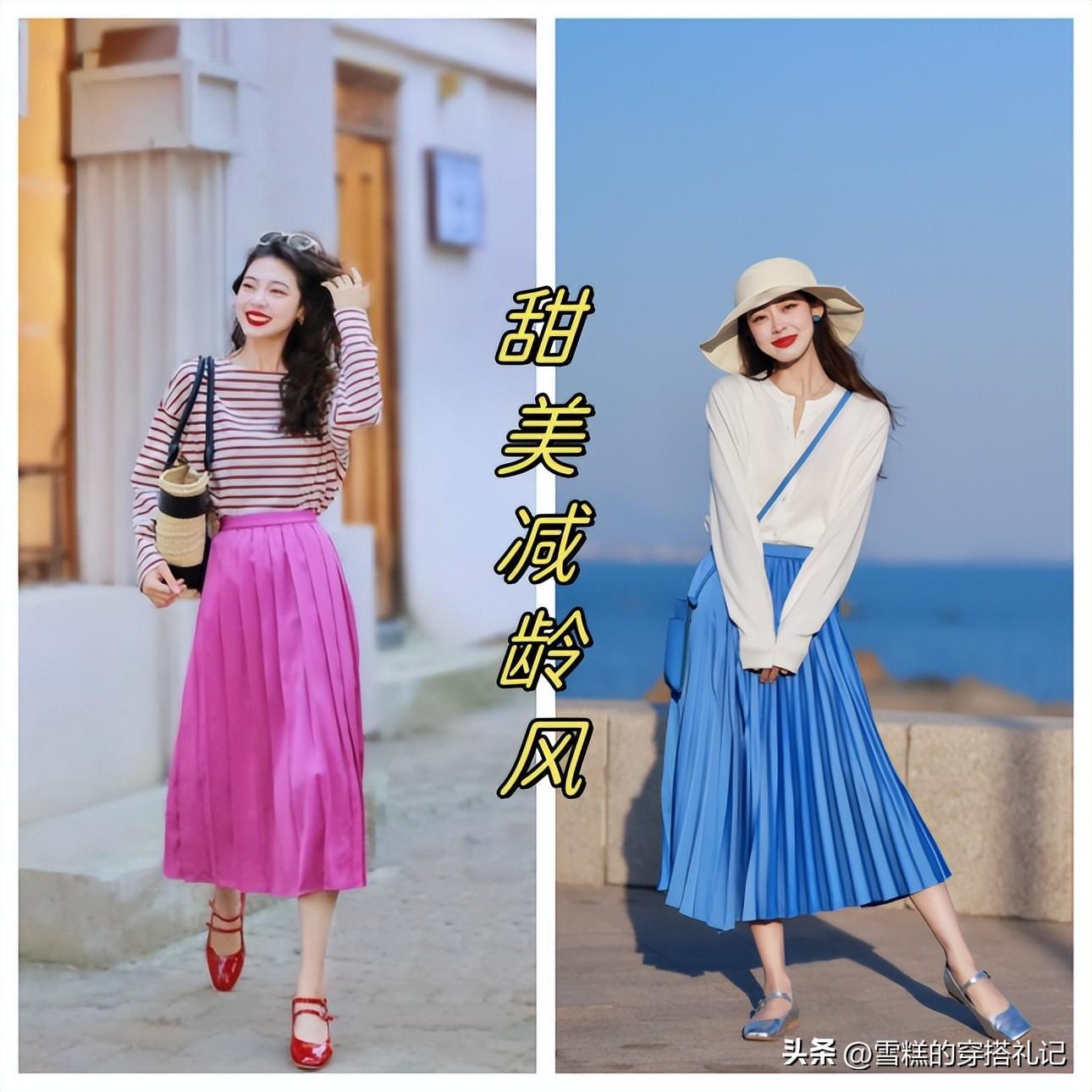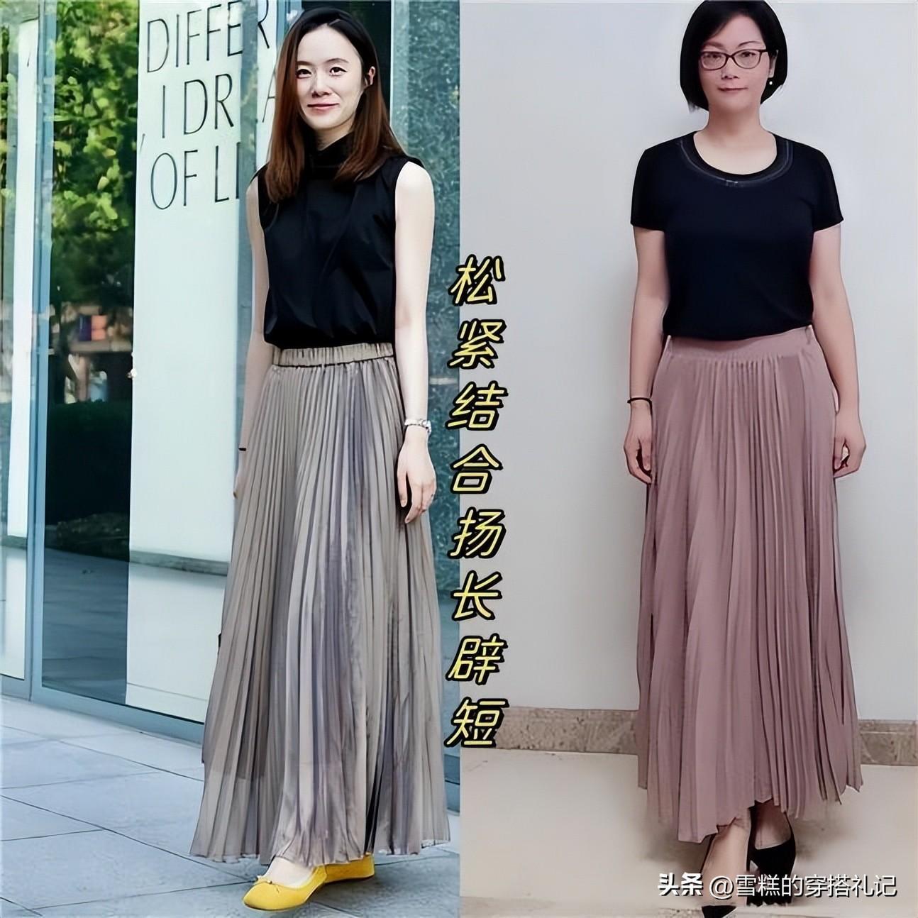 我們可以選擇版型比較寬鬆的長裙來起到很好的顯瘦效果,可以優先考慮具有靈動和飄逸感的百褶裙。結合富有垂順感的面料,能夠起到拉長腿部線條的效果。而在上衣的選擇上,建議搭配修身的款式,鬆緊對比之下可以讓我們整體看上去更加纖細。