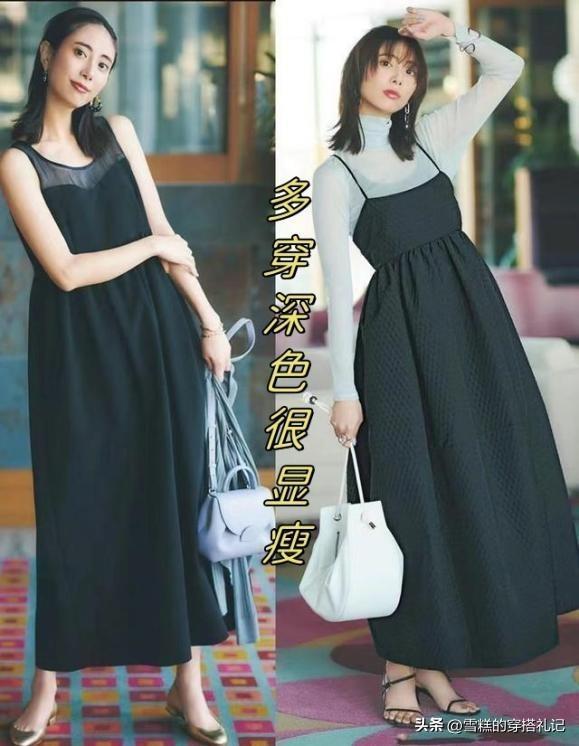 深色具有很好的收縮力,對於許多氣質女性來說,也會更加傾向於選擇能夠反映出穩重而內斂品質的顏色。不過如果是深色的連衣裙,一定要注意避免沉悶感。我們可以採用無袖、吊帶或者是露出腳踝的設計,利用露膚度去削弱嚴肅感。或者是結合疊穿的技巧,利用淺色的上衣搭配深色吊帶裙,去顯得更加清爽一些。