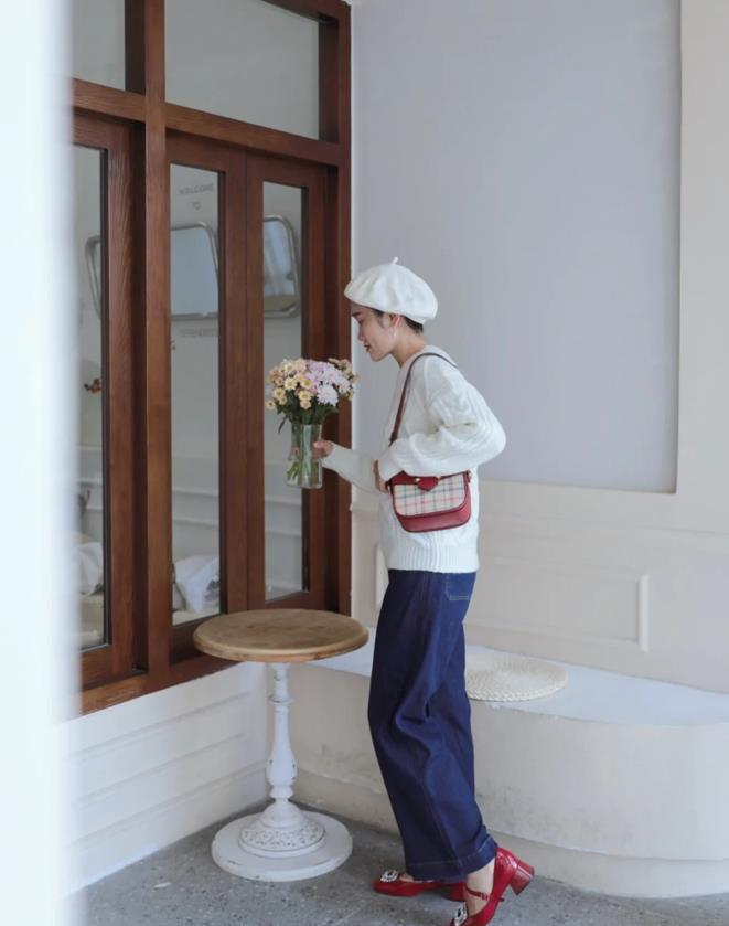 輕法式的一套,秋天的第一件毛衣就選擇白色毛衣吧,上身慵懶卻不會太顯臃腫,基礎款式,加上絞花的款式,滿滿的細節感,搭配牛仔闊腿褲,寬鬆的褲型,可太藏肉顯瘦了,一雙紅色瑪麗珍單鞋,點亮了整個造型。