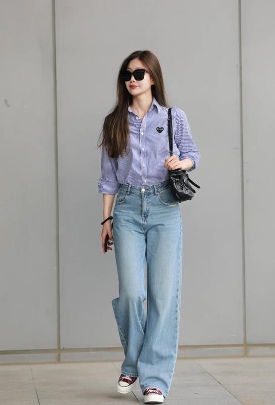 藍白相間的條紋襯衫,真的是自帶乾淨氣息,也很顯氣質,版型寬度適中,穿起來可舒適自在了,搭配起一條牛仔闊腿褲,這種垂墜感和版型都極佳的褲子,真的非常顯瘦,鞋子配的是一雙帆布鞋,可舒適自在了。