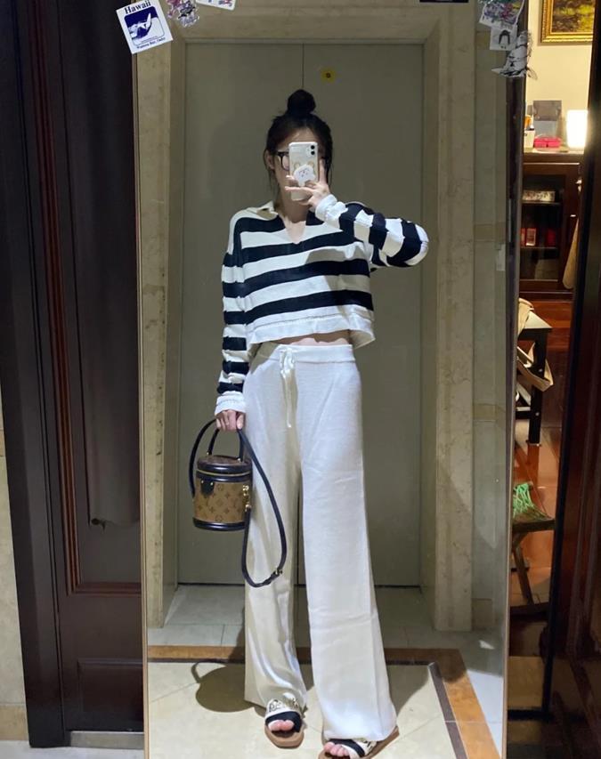 不管是上班,還是日常休閒都很合適的一套,這條白色闊腿褲穿起來也太舒服了吧,關鍵是垂墜感極佳的,選擇短款條紋衛衣來配,上短下長的搭配,能很好優化整個身材比例,一整個顯高挑。