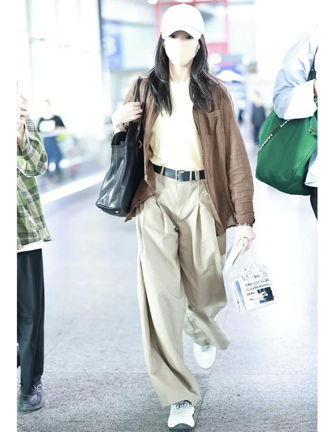 咖啡色的襯衫與杏色闊腿褲,休閒又非常有型,內搭裏面還疊穿了件白色t恤,頗顯層次感的一套,選擇杏色的闊腿褲相配,腳上再踩着一雙白色運動鞋,休閒隨性又自在,整體看起來也非常大氣。