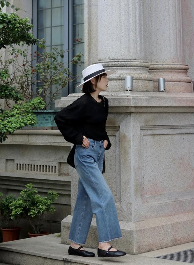 自帶法式風的一套,黑藍配色,也太高級了吧,休閒舒適又自在,雖然是簡簡單單的穿搭,卻非常時髦。黑色長袖+牛仔闊腿褲,鞋子配的是一雙黑色瑪麗珍單鞋,不僅穿起來舒適,還很顯溫柔。
