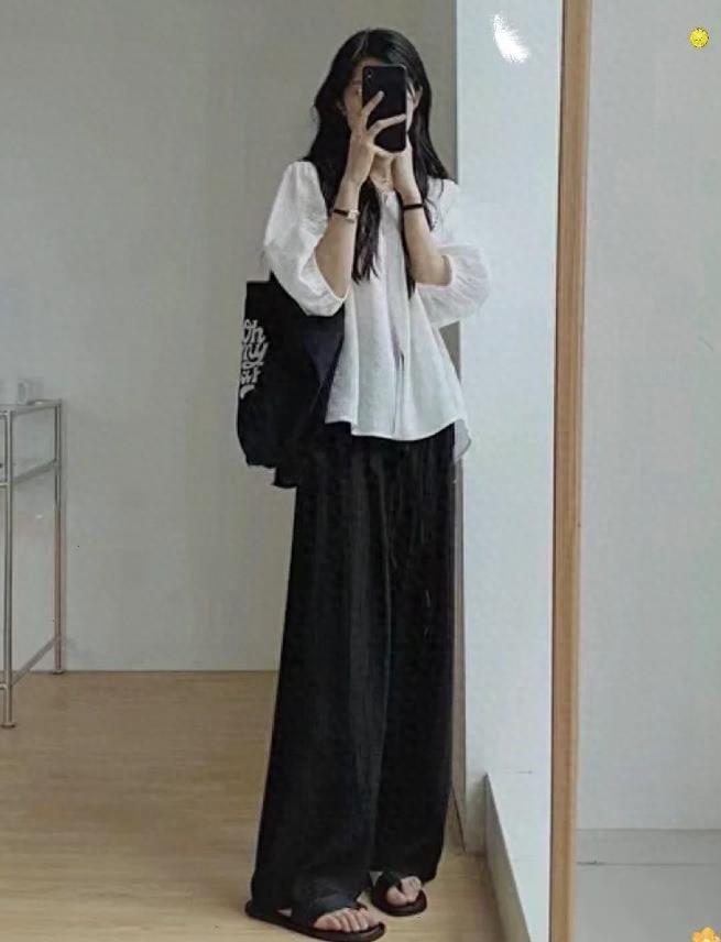這一套慵懶感的穿搭,我真的是太喜歡了,簡約休閒風,既不失日常又好看,黑色不規則短上衣+米白色拖地闊腿褲,褲子的垂墜感極佳的,可以很好在視覺上拉長腿部線條,腳下是一雙黑色涼拖鞋,與上衣進行了色彩呼應。