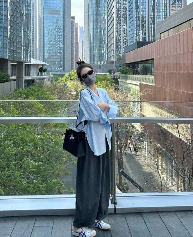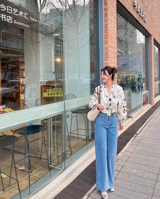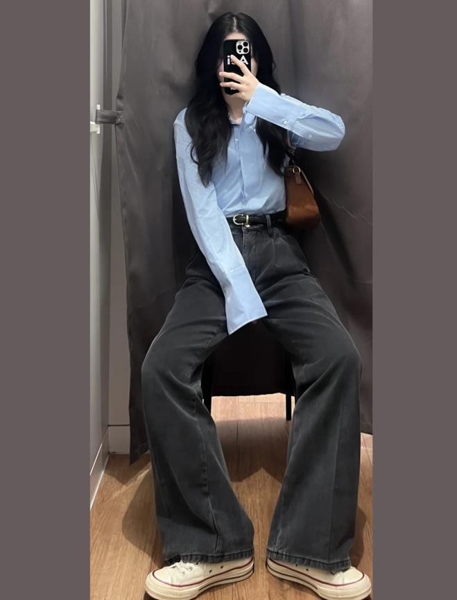 簡約舒適的一套韓系穿搭,經典藍色襯衫+菸灰色牛仔闊腿褲,一整個顯高級感,襯衫的顏色很顯白,也自帶清爽氣息,完全不會出錯的組合,不管是約會、通勤都可以。
