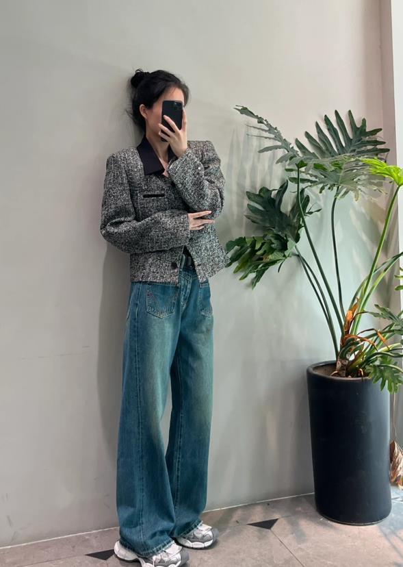 輕熟小香風穿搭,看起來就很顯氣質呢,短款的小香風外套,很適合小個子女生的款式,精緻的小翻領,同樣闊腿牛仔褲搭配一起,舒適又帥氣,利用上短下長的組合,輕鬆優化整個身材比例。