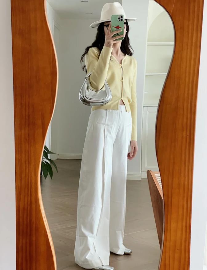 這一套簡直是行走的“芝士奶酪”,淡淡的鵝黃色,很襯膚色和顯白,哪怕是黃黑皮的女生,都是可以駕馭的,小短款,個矮的女生也能輕鬆駕馭。選擇一條白色闊腿褲來配,真的太顯瘦藏肉了,腳上踩着一雙銀色瑪麗珍單鞋,和手裏的包包進行了色彩呼應,增加了造型和諧度。