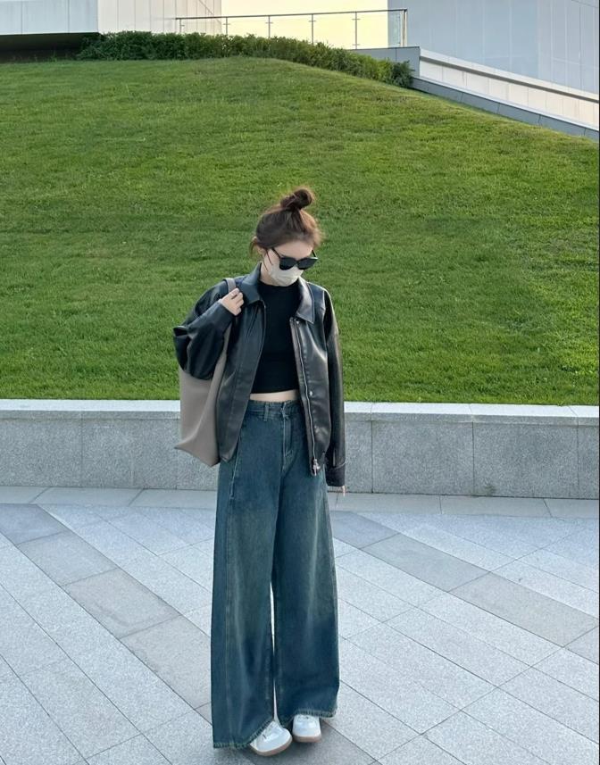 黑色皮衣+牛仔闊腿褲,看起來就很酷帥的一套,高腰闊腿褲,穿在身上能很好拉長腿部線條,加上寬鬆的褲型,可太藏肉顯瘦了。鞋子配的是一雙運動鞋,很休閒舒適,也爲整個穿搭增添了一份青春活力。