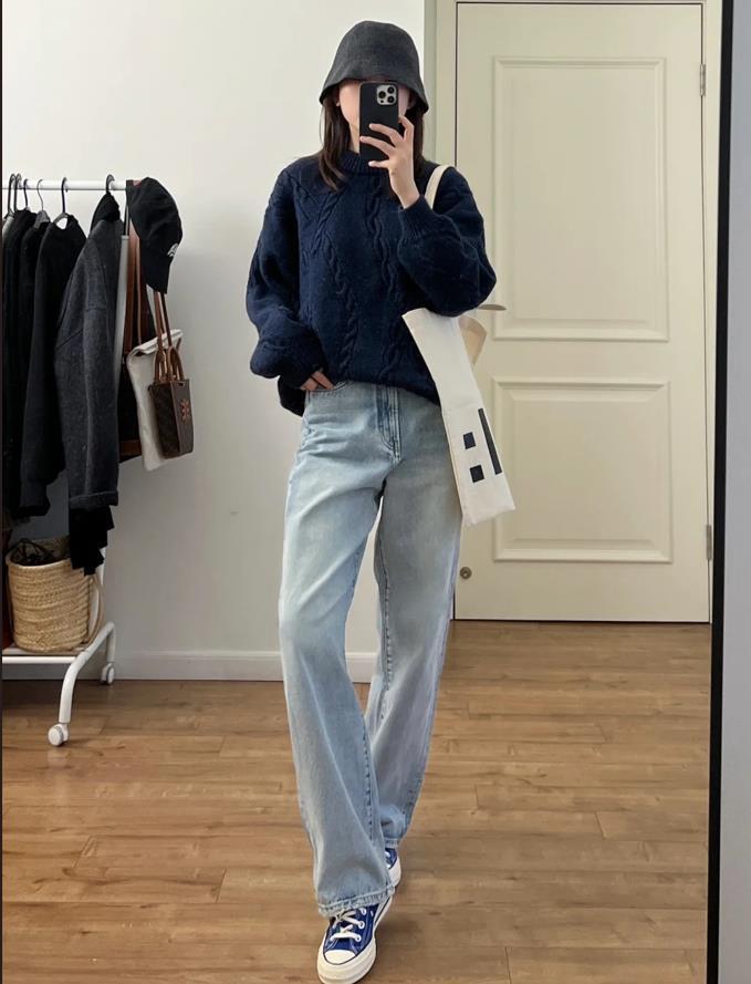 絞花款式的毛衣,細節感還是蠻強的,還有就是它這個顏色,是藏藍色的,穿起來也不會顯得太沉悶了,選擇一條牛仔闊腿褲來配,褲子的面料質感極佳,加上直筒的闊腿褲型,可太修飾腿部線條了,也非常顯瘦。
