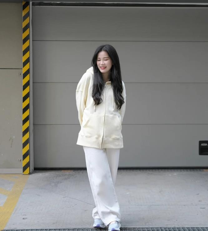 休閒運動風真的是怎麼都看不膩啊,很簡約耐看又幹淨的一身,衛衣與闊腿褲組合,很鬆弛隨性的一套,整個配色很乾淨,牛仔闊腿褲雖然是白色的,但穿在身上卻很藏肉顯瘦,完全不會顯胖的。