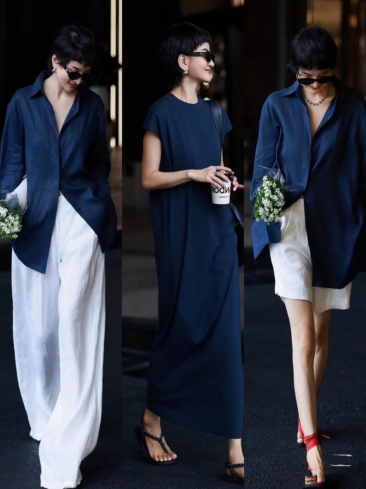 寬鬆且簡潔的襯衫,可以直接配褲子、也可以當作小外套來穿着,寬鬆的藏藍色襯衫,配一條白色闊腿褲,乾淨又酷颯,非常的醒目。