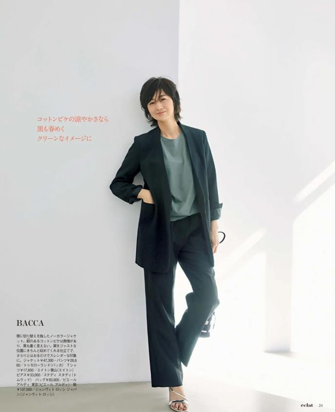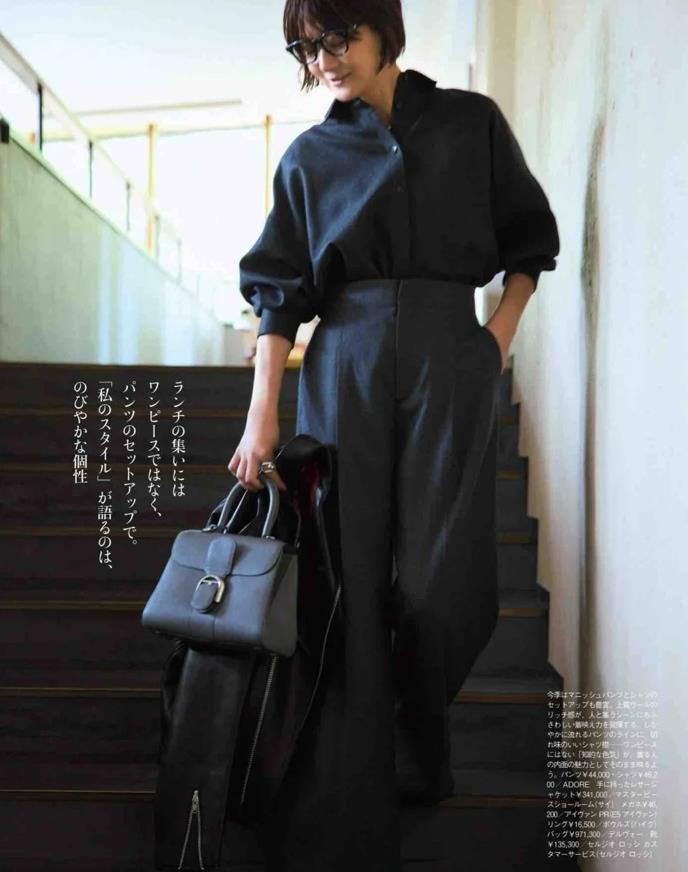一身黑色系的打扮,看起來就很顯沉穩氣質,最重要的是顯瘦,富岡佳子身上這套,看起來也太優雅氣質了,襯衫全部束起來,提高了腰線比例,又拉長了雙腿線條,視覺上有種大長腿的既視感,一秒就打造出強大氣場。