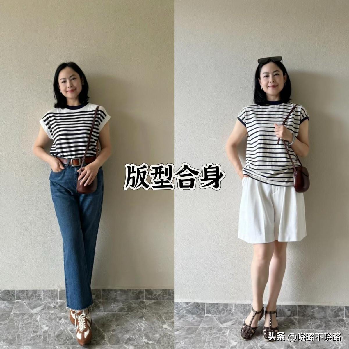 其次,我們還要考慮到版型上的裁剪,女人上了年紀之後,身材就不再像年輕時那樣苗條纖細,所以條紋衫的版型不能太緊身,帶點微寬鬆的設計,更具備遮肉的功效。