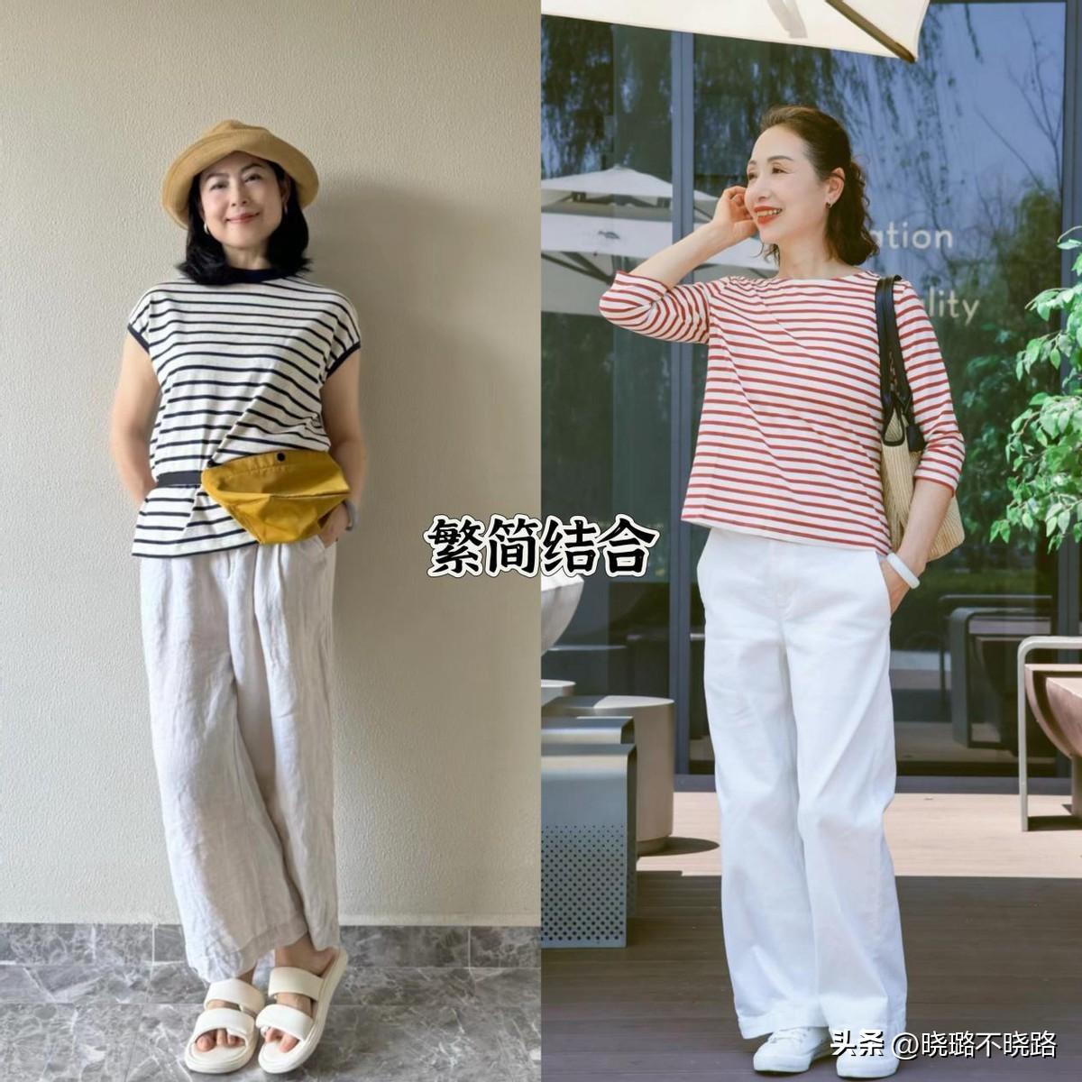 大齡女人在具體搭配條紋衫的時候,除了要選對上衣和下裝的款式,應當考慮到二者之間的關係。基礎款式的條紋衫,很適合跟白色直筒褲進行組合,簡約清爽還特別減齡。