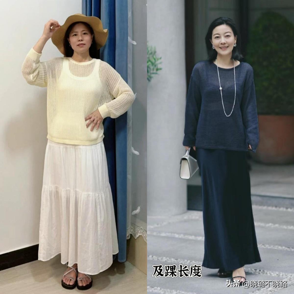 像這種同色系的搭配方式,整體性就非常強,奶白色的鏤空罩衫+拼接款及踝裙,All white的組合太養眼了;黑色罩衫和絲綢裙的搭配,就算是配涼鞋,也很高級。
