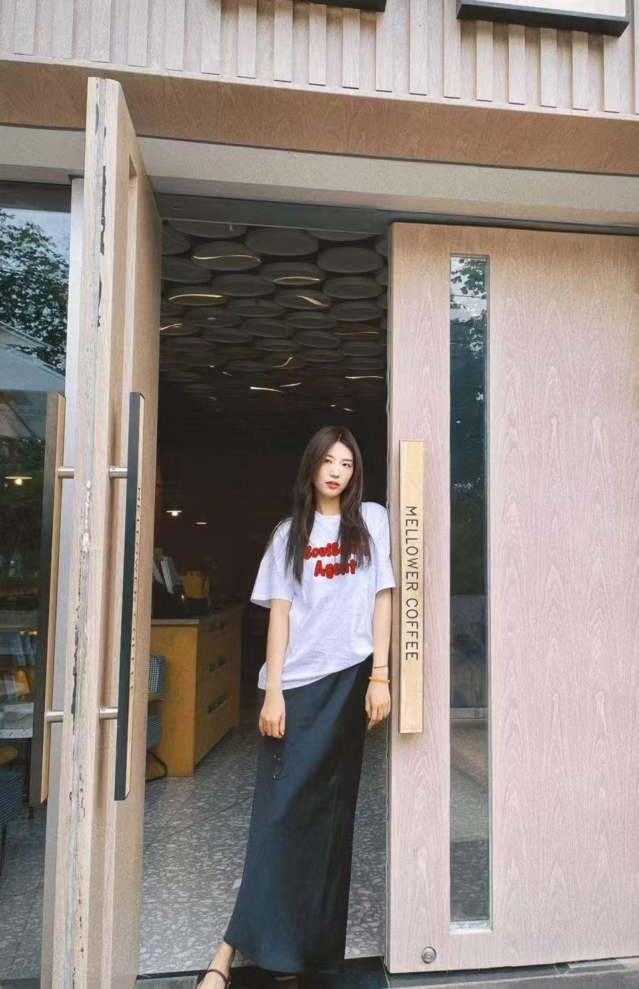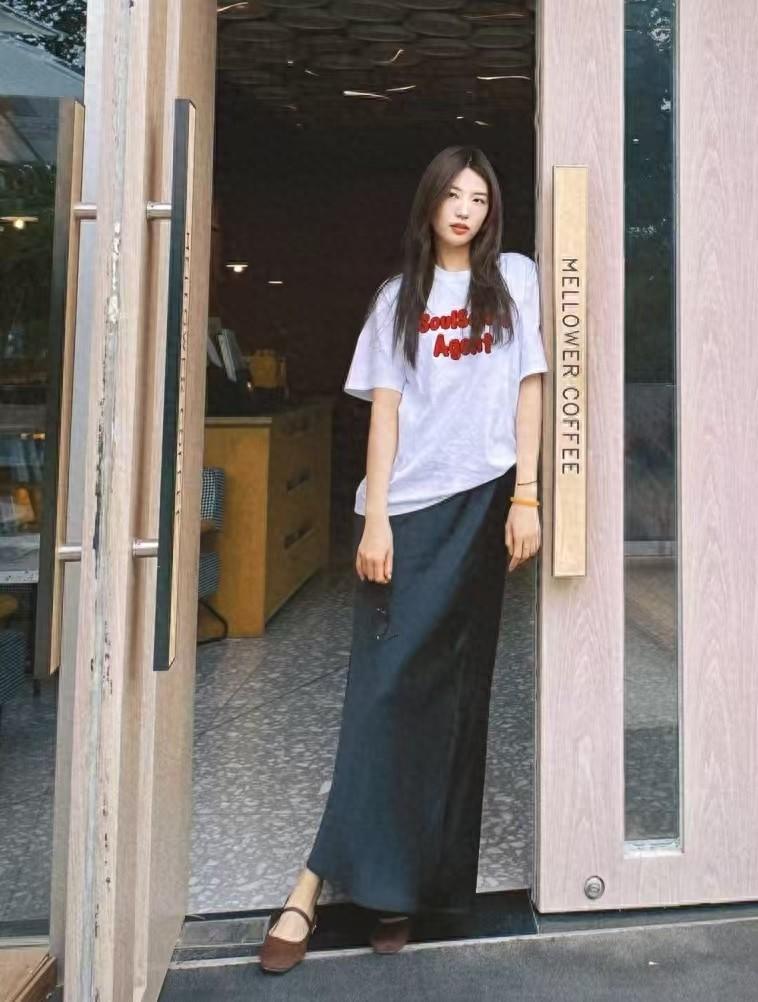 穿T恤搭配長裙的時候,沒必要把T恤衣襬塞進裙腰,營造出大長腿即視感。將T恤衣襬自然下垂,就像下面兩位博主這樣,演繹慵懶隨性時尚感。