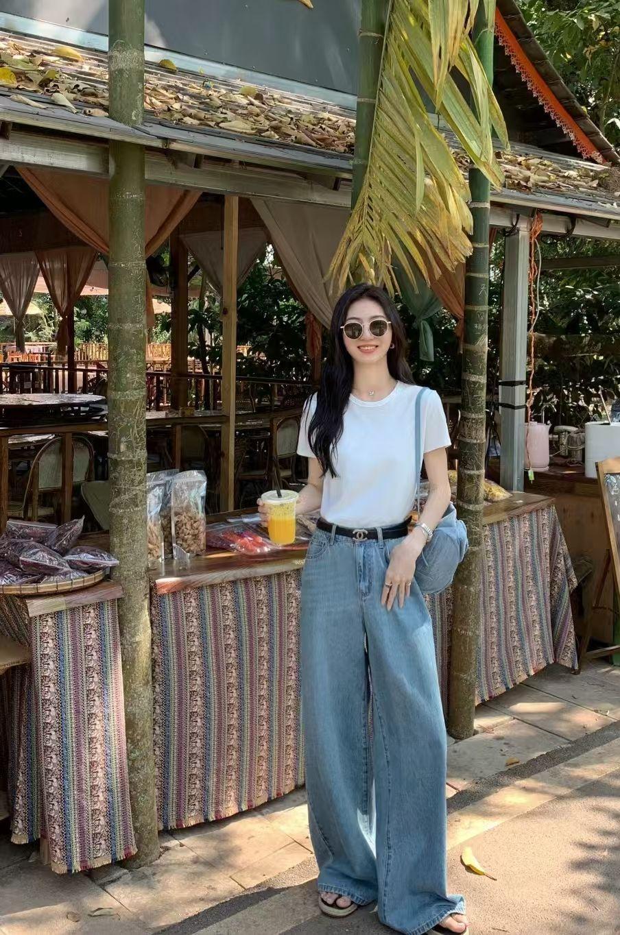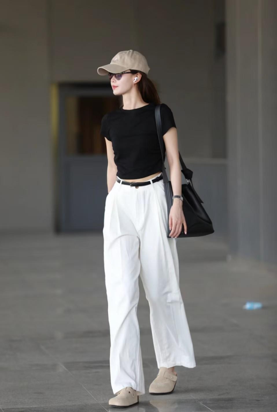T恤與闊腿褲進行搭配的話,建議大家選擇衣襬偏緊、衣長偏短的露臍T恤,好比這身“黑色露臍T恤+白色闊腿褲”,演繹隨性時尚感的同時,又展現出優越的腰臀比。