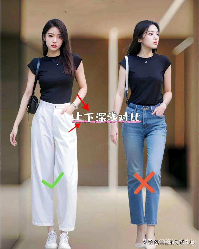 上緊下寬的穿搭學會作用顏色的搭配,能達到更佳的視覺效果。推薦採用對比的配色方法,也就是有深淺的差異。上半身儘量選擇深色款式,下半身選擇淺色款式,這樣的寬窄差異更明顯,顯瘦度更佳,穿搭的層次也得到了豐富。