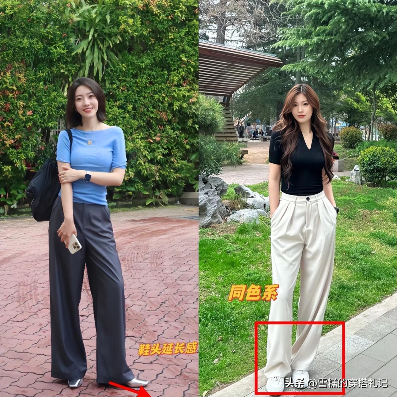 要正確的做到下半身的視覺延長,和鞋子搭配脫不開關係。當我們搭配的是全分長闊褲,鞋頭的設計以及鞋跟是很關鍵的要點,個子比較高的女人可以選平跟,但是鞋頭要帶延長的作用,長尖頭或者是方尖頭是能延長全分褲的最佳款,小個子穿它時要加帶低跟。
