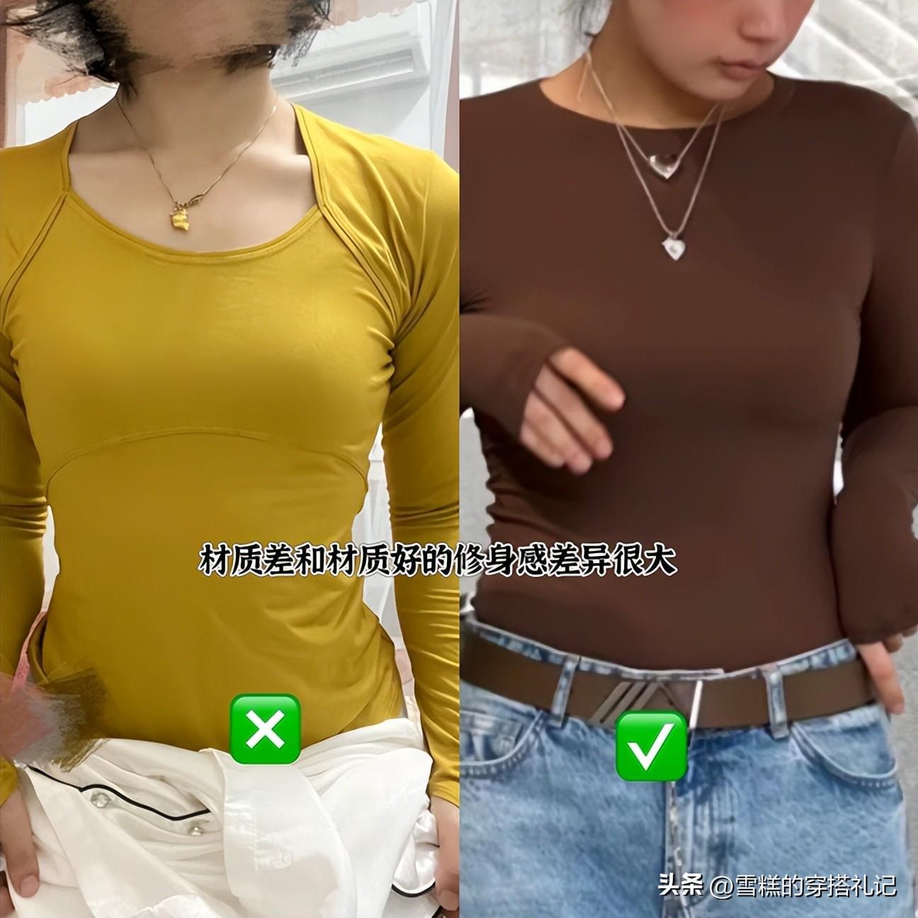 緊身的衣服想要顯瘦沒有肉感,跟衣服的材質脫不了關係,從上面的材質差異對比圖,就可以看出來左圖爲一件材質面料差的款式,上身容易形成褶皺感既不顯瘦還顯得廉價;右邊圖好的上身有着平滑的線條,並且能遮住多餘的贅肉,顯瘦又高級。