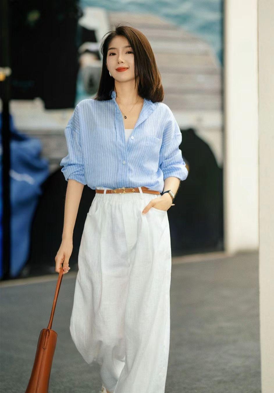 簡約乾淨的配色方案,並不是指色彩種類越少,越顯簡約乾淨,而是指色彩一亮一暗,一深一淺,張弛有度。如同這身“藍色襯衫+白色闊腿褲”造型,既演繹出簡約氣質,又女神範十足。