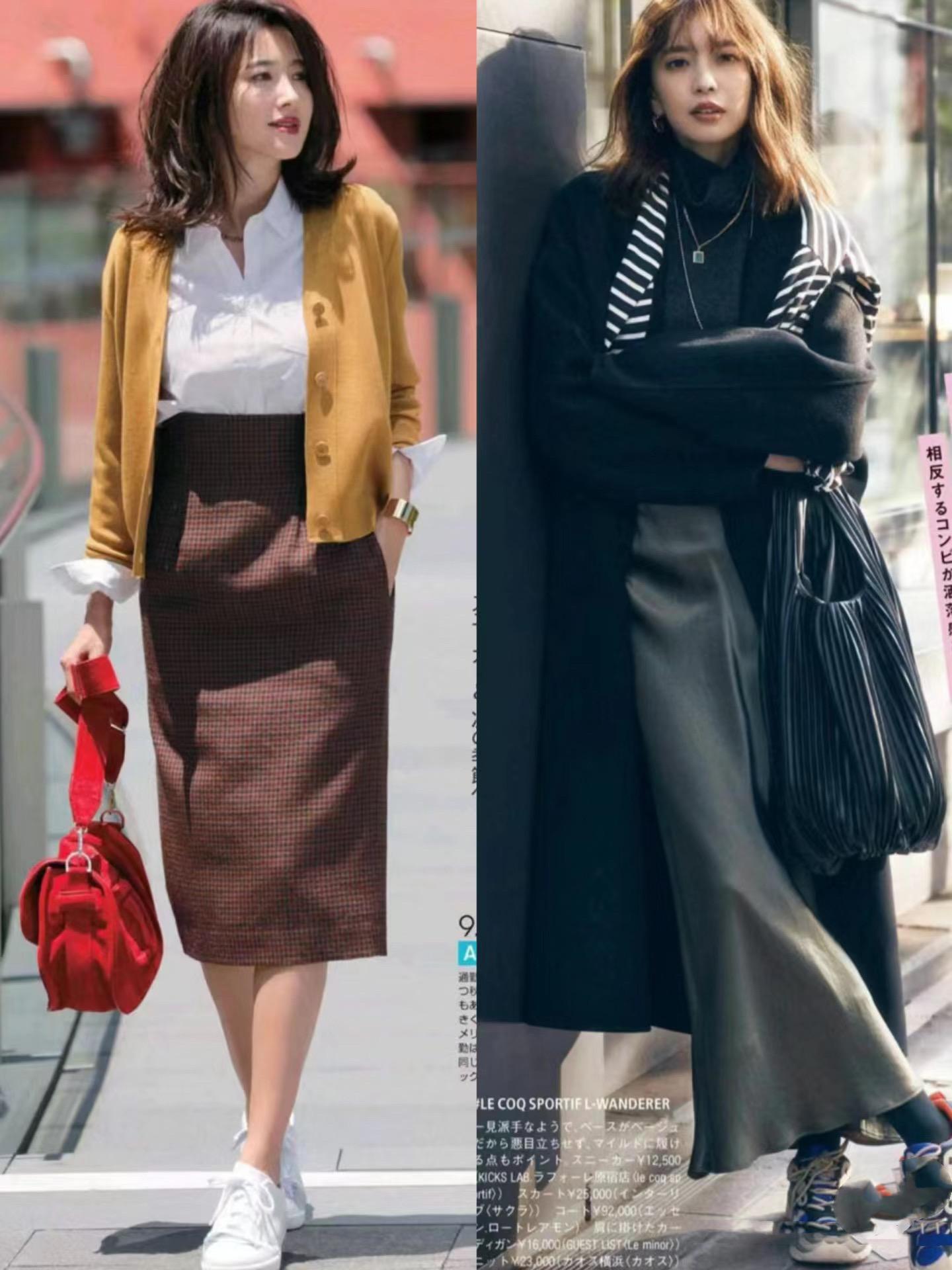 秋天裏的半身裙,以高腰、過膝、厚實面料爲主要特點。我們可以選擇高腰的直筒半身裙、或者高腰的傘裙。