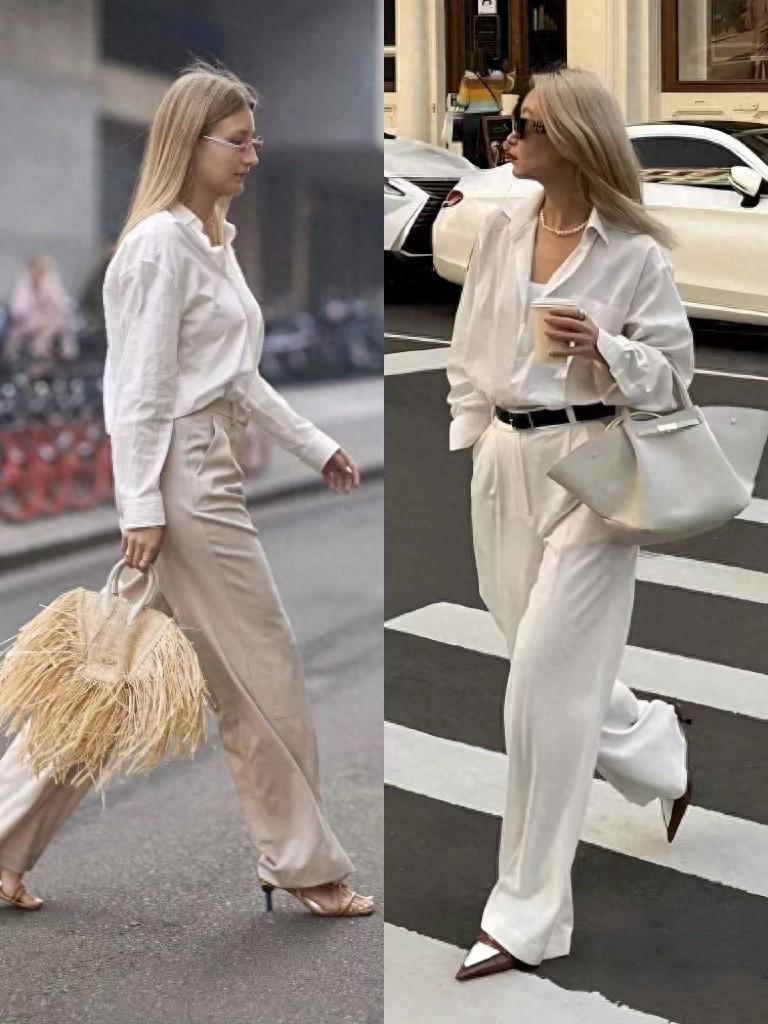 白色高腰褲,儘量搭配淺色的高跟鞋。比如同樣的白色、米白色、銀色、淺卡其色或者杏色高跟鞋,都更顯溫柔一些,鄰近色的搭配也很顯高。白色闊腿褲的穿搭,也更體面時尚。